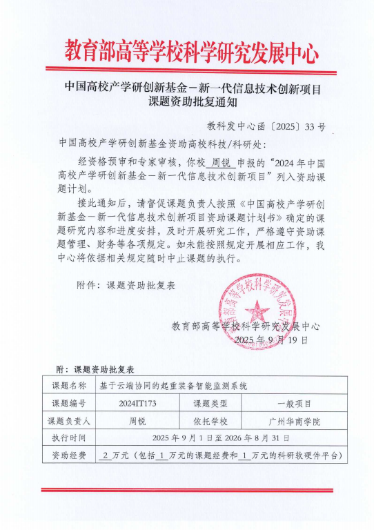 2025近日,由人工智能学院周锐科研团队申报的中国高校产学研创新基金—新一代信息技术创新项目“基于云端协同的起重装备智能监测系统”正式获批立项。该项目由教育部高等学校科学研究发展中心批准立项,是威廉希尔中文网站首次获批此类基金项目。项目面向新一代信息技术发展趋势,聚焦起重装备在实际工程中的智能化、信息化与系统协同等关键问题,旨在通过校企协同攻关,推动技术创新与成果转化。(信息技术创新项目课题资助批复)此次立项是我...