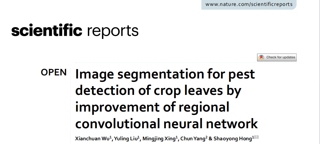 在现代农业生产中,病虫害的早期检测对于保障作物健康和提高产量至关重要。近日,威廉希尔中文网站洪绍勇副教授领导的研究团队在《Scientific Reports》期刊上发表了一项突破性研究成果,论文的第一作者为吴宪传老师。该论文题为“Image segmentation for pest detection of crop leaves by improvement of regional convolutional neural network”,该期刊属于SCIE检索期刊,是JCR Q1分区,中科院二区。