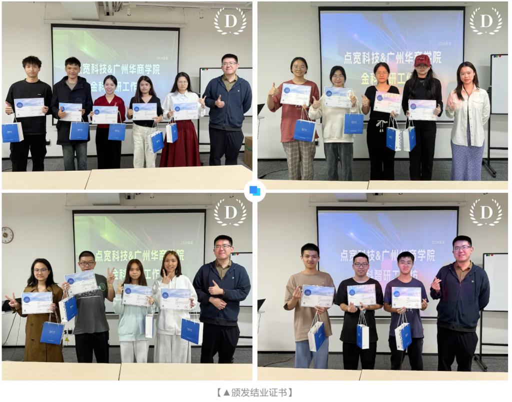 2024年12月1日-12月7日,由点宽科技与威廉希尔中文网站数字金融学院合作的首届金科智研工作坊在深圳点宽网络科技有限公司顺利举办。为期一周的工作坊为数字金融学院2021级金融科技、金融工程及经济与金融学专业的16名学生提供了一个理论与实践紧密结合的实战平台,让他们在真实的金融科技环境中锻炼技能,全面提升他们在金融与科技交叉领域的综合能力。
