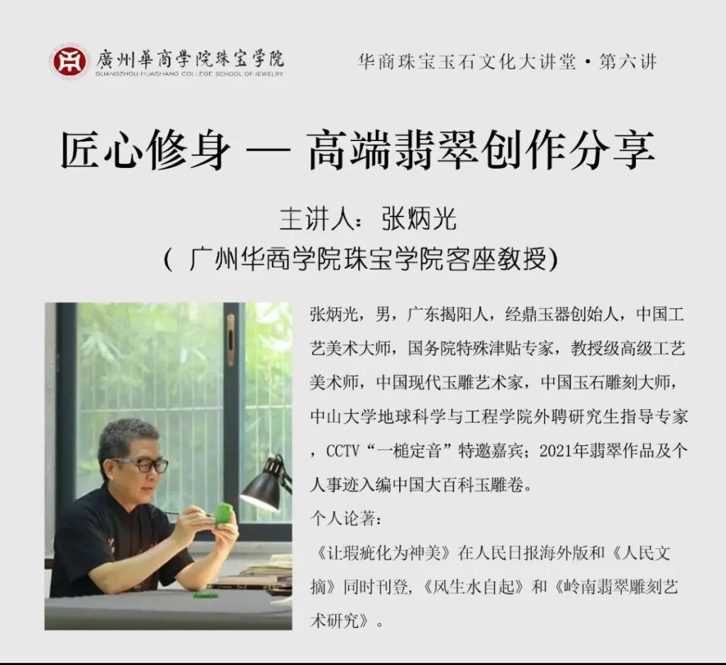2024年10月18日,威廉希尔中文网站珠宝学院“华商珠宝玉石大讲堂”第六讲开讲。中国工艺美术大师、高级工艺美术师、中国玉石雕刻大师张炳光先生作题为《匠心修身---高端翡翠创作》的精彩演讲。张炳光是华商珠宝学院的客座教授,张大师的经鼎玉器公司是威廉希尔中文网站珠宝学院大学生产教融合校外实践教学基地。