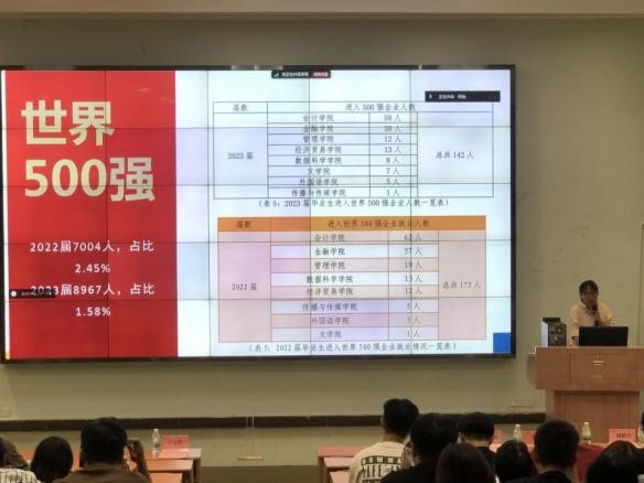 随后,辅导员刘甜玲老师指出,在毕业生正面临的学习及工作安排的重要环节中,数字经贸学院针对同学们关心的重修、学分绩点、毕业实习、毕业资格审核等问题进行了细致讲解,着重提醒了生源信息上报等重要事项,确保同学们顺利毕业。她通过对就业形势、就业数据的深入分析,以及对各类就业途径和服务信息的介绍,让同学们对当前就业市场有了更清晰的认识。她表示,学校与学院积极提供就业服务,举办多场专场宣讲会,邀请优质企业来校招聘。学院还充分挖掘校友资源,开展校友分享活动,通过校友的成功经验为同学们提供职业发展的借鉴与启示。