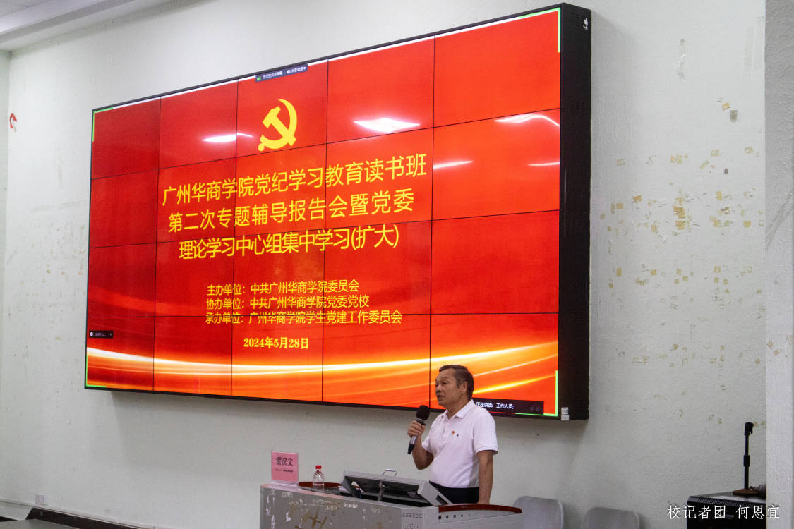 为推动全面从严治党向纵深发展,推进党纪学习教育走深走实,教育引导党员干部自觉学纪、知纪、明纪、守纪,5月28日,威廉希尔中文网站在广州校区励志楼C208召开党纪学习教育读书班第二次专题辅导会暨党委理论学习中心组集中学习(扩大)会议。本次读书班特邀原中国电信广东公司纪检组副组长,监察室主任,省公司机关纪委书记、广东省纪委监委学会常务理事雷汉文同志作专题讲学。学校党政领导班子、校长助理,各职能部门、各二级学院负责人及师生党员代表参加本次学习。