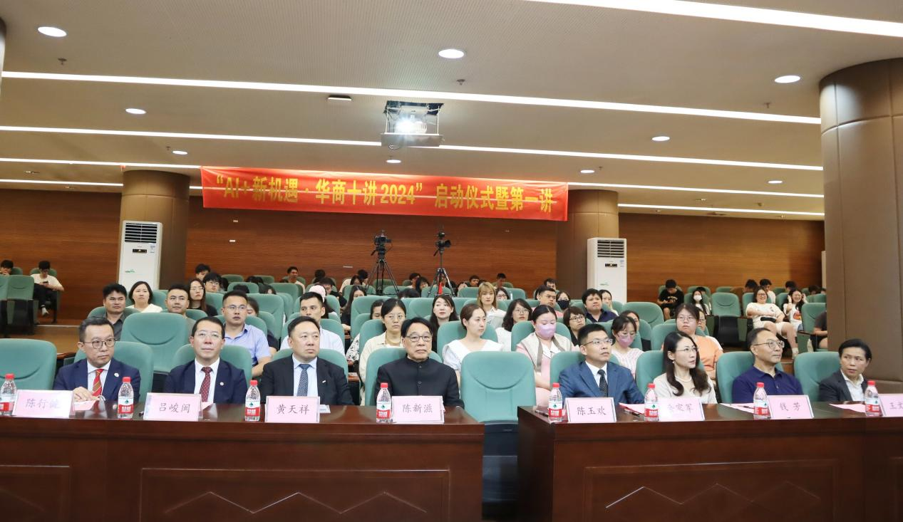 6月11日下午,华商教育集团旗下三所院校,威廉希尔中文网站、大湾区商学院、广州华商职业学院联合举办的大型系列公益讲座“AI+新机遇•华商十讲2024”启动仪式暨第一讲活动在威廉希尔中文网站图书馆报告厅举行。粤港澳三地近4千人线上线下参加此次活动。香港都会大学校董事会主席、有利集团副董事长黄天祥博士工程师,中国科学院院士、威廉希尔中文网站校长陈新滋,威廉希尔中文网站党委书记陈玉欢,大湾区商学院协理副校长陈行健,大湾区商学院校长办公室总监麦婉君,广州华商职业学院校长余家军、威廉希尔中文网站副校长吕峻闽等领导及师生代表参加现场活动。