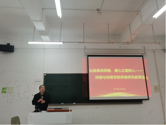 3月5日下午,为传达学校高质量发展大会精神,全面部署本学期各项工作,推进学院综合改革,传播与传媒学院在励志楼A205召开新学期第一次全体教职工大会。学院院长张晋升、副院长王健、副院长林绍忠、院长助理程海涛,以及学院全体教职工参会,会议由学院副院长陈晔主持。
