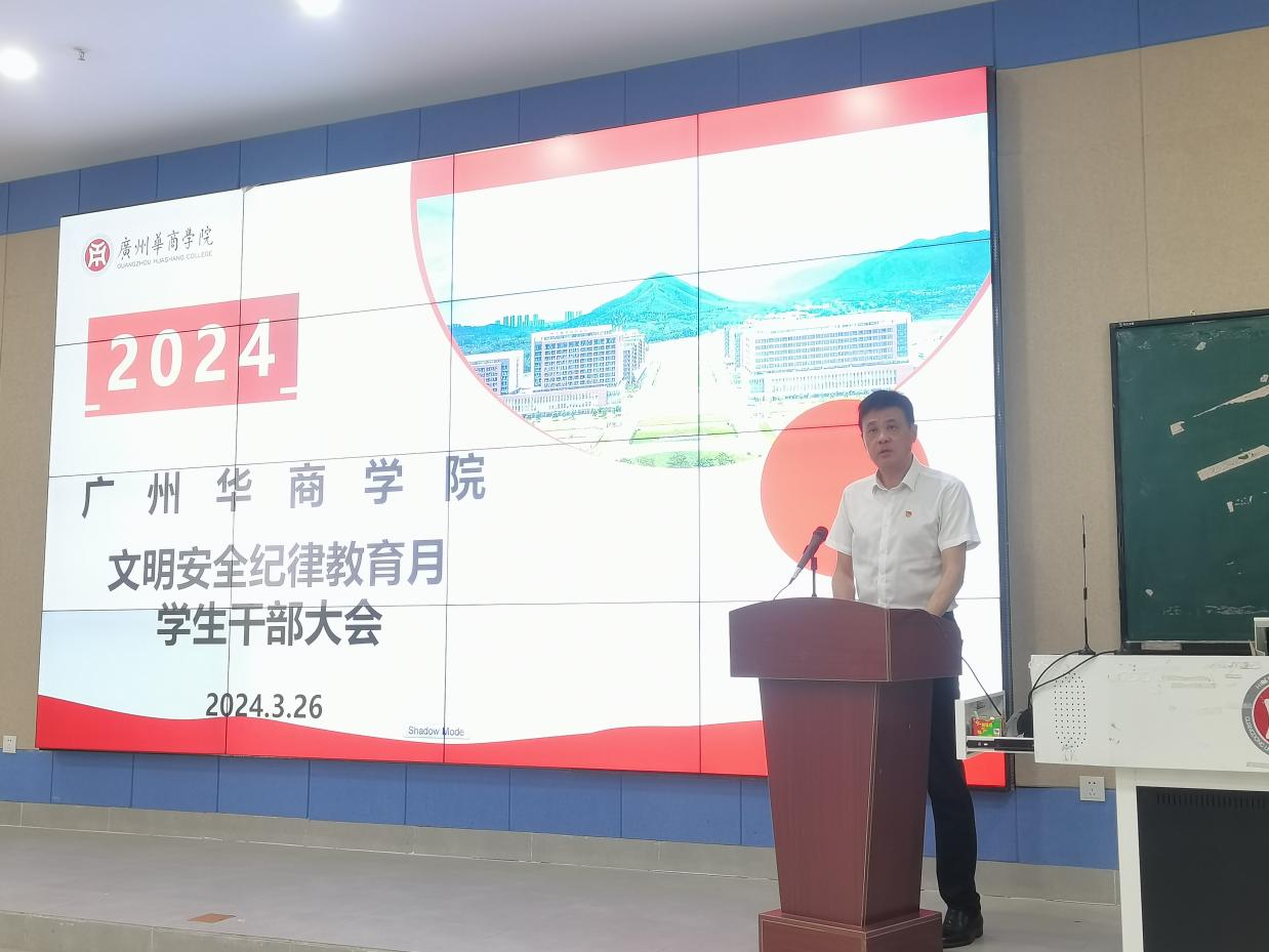 2024年3月26日下午14:30,威廉希尔中文网站肇庆校区在8号楼108室召开文明安全纪律教育月学生干部大会。出席本次会议的有:威廉希尔中文网站副校长王卫平教授,肇庆校区党委书记苏宁,校长助理、肇庆校区管委会常务副主任覃少冰同志,管委会副主任、学生工作办公室主任付蔚莹同志,后勤保卫办公室副主任徐强同志,学生工作办公室思教科副科长古文胜同志以及各学院学工负责人及学生干部代表,此次会议由古文胜老师主持。