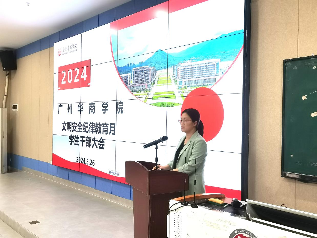 学生骨干代表赖楚怡同学代表全体学生骨干发言。她向大家提出了两点倡议:一是全体学生骨干应做到知行合一,以知促行,以行求知。二是全体学生骨干应牢记以身作则,厚植文明纪律理念,形成共生效应。应自觉遵守校规校纪,严格要求自己的言行举止,秉持正确的价值观,做一个讲文明、守纪律、有道德素养的华商青年。