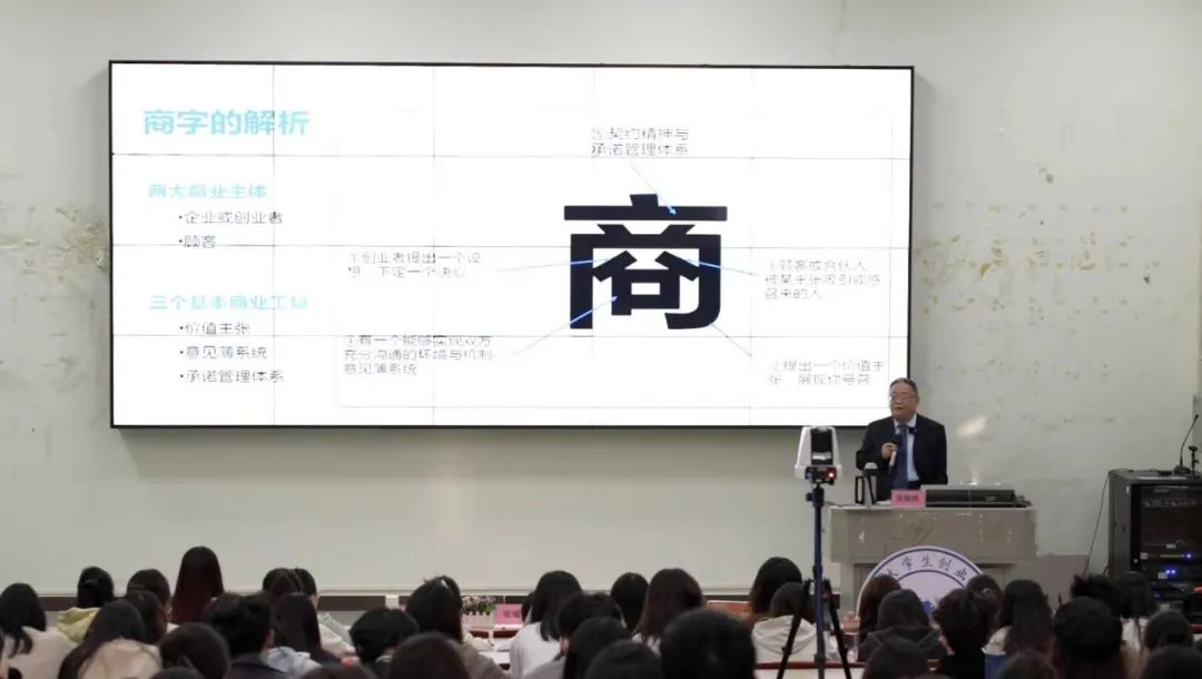 最后,张耀辉教授重点阐述了“商”的基本原理和作用并向同学们解读了华商师生的精神核心,即“和而不同”“天人合一”“上善若水”,并进一步引出了中华文化的核心思想,强调企业要追求“终身责任”并做到“终身信任”以此来强化品牌、留住客户。
