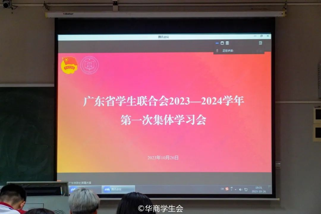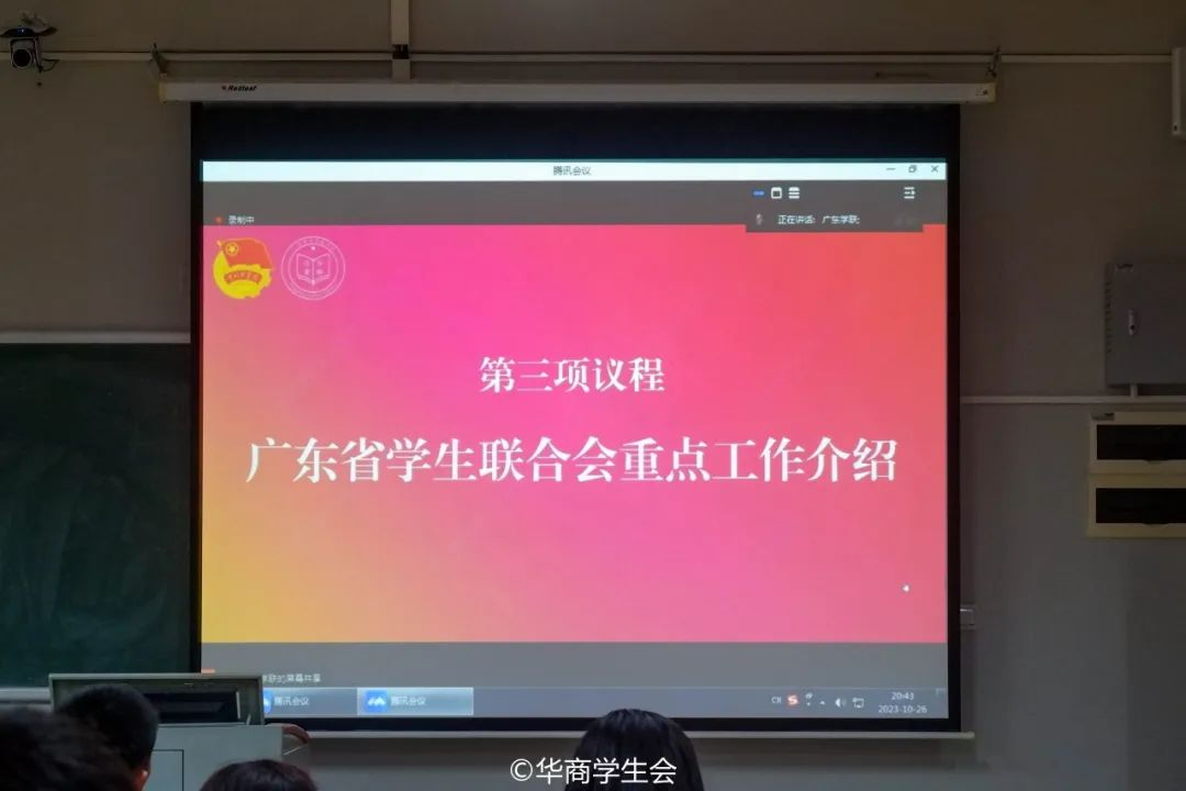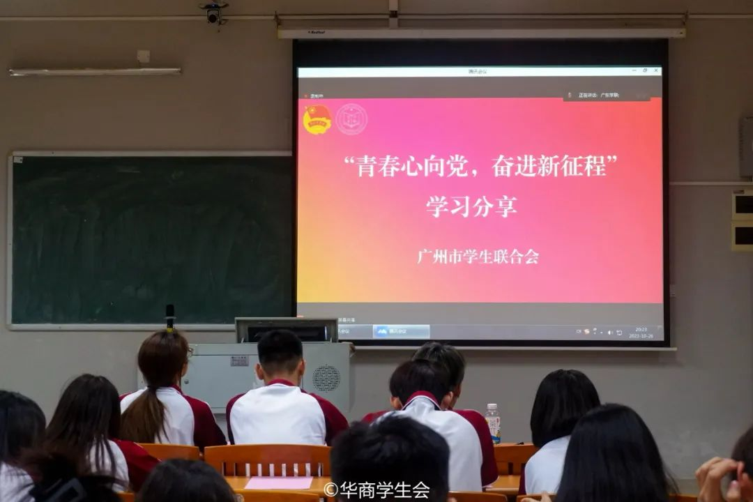 为深入学习宣传贯彻党的二十大精神,贯彻落实习近平总书记关于青年工作的重要思想,进一步巩固深化新时代高校学生会改革和建设,加强广东学联学生会组织的理论学习和组织建设,不断增强“四个意识”、坚定“四个自信”、做到“两个维护”。广东省学生联合会2023-2024学年第一次集体学习会(华商分会场)于2023年10月26日在增城校区启智楼303、四会校区6号楼202同步举行。校团委老师、二级学院学生会指导老师、校院两级学生会主席团成员参与本次会议。