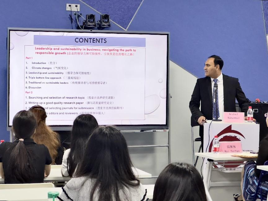 为拓宽大学生的国际视野,了解管理学和领导科学的最新研究成果,2023年11月8日,国际学院在启智楼401举行主题为“Leadership and sustainability in business:navigating the path to responsible growth”(企业的领导力和可持续性:引领负责任的增长之路)的文化素质讲座。巴基斯坦籍Arshad Muhammad博士担任主讲嘉宾,威廉希尔中文网站国际学院院长回雁雁、巴基斯坦籍教师Aneela Qadir博士、国际学院ACCA专员姚晓敏以及来自国际学院、健康医学院、管理学院、外国语学院、文学院、数据与科学学院的30多名大学生现场聆听了讲座。