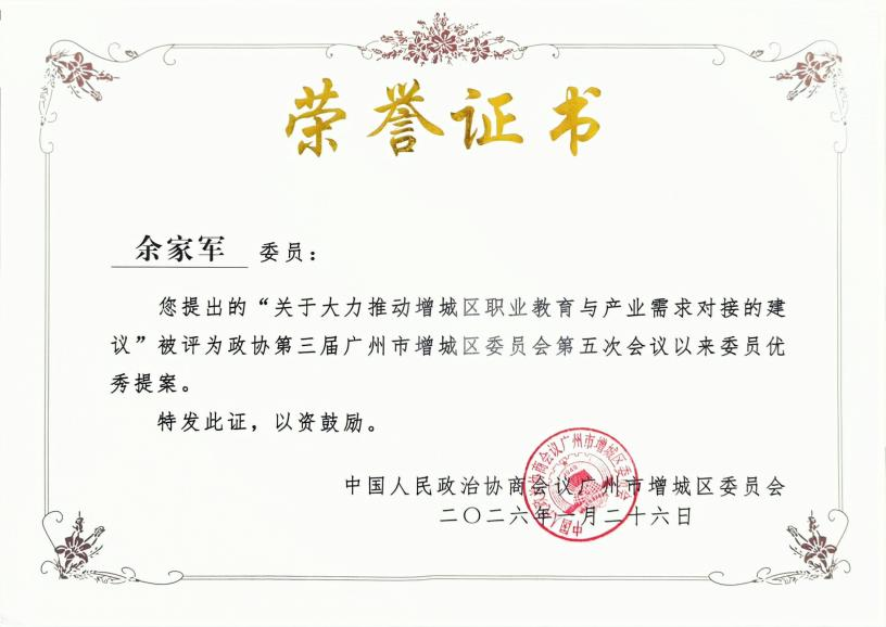 期间,余家军提交的《关于大力推动增城区职业教育与产业需求对接的建议》获评区政协第三届五次会议以来“委员优秀提案”。