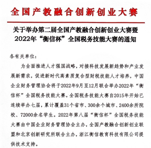 为培养新时代高素质复合型财税技能人才,由2022年第八届“衡信杯”全国税务技能大赛于2022年9月至12月举行,由中国企业财务管理协会主办,全国产教融合创新创业联盟和北京创新研究所联合主办,浙江衡信教育科技有限公司提供技术支持。 “衡信杯”全国税务技能大赛自2015年开始已连续举办七届,累计覆盖31个省市、300余个城市、2400余所院校、72000余名学生。