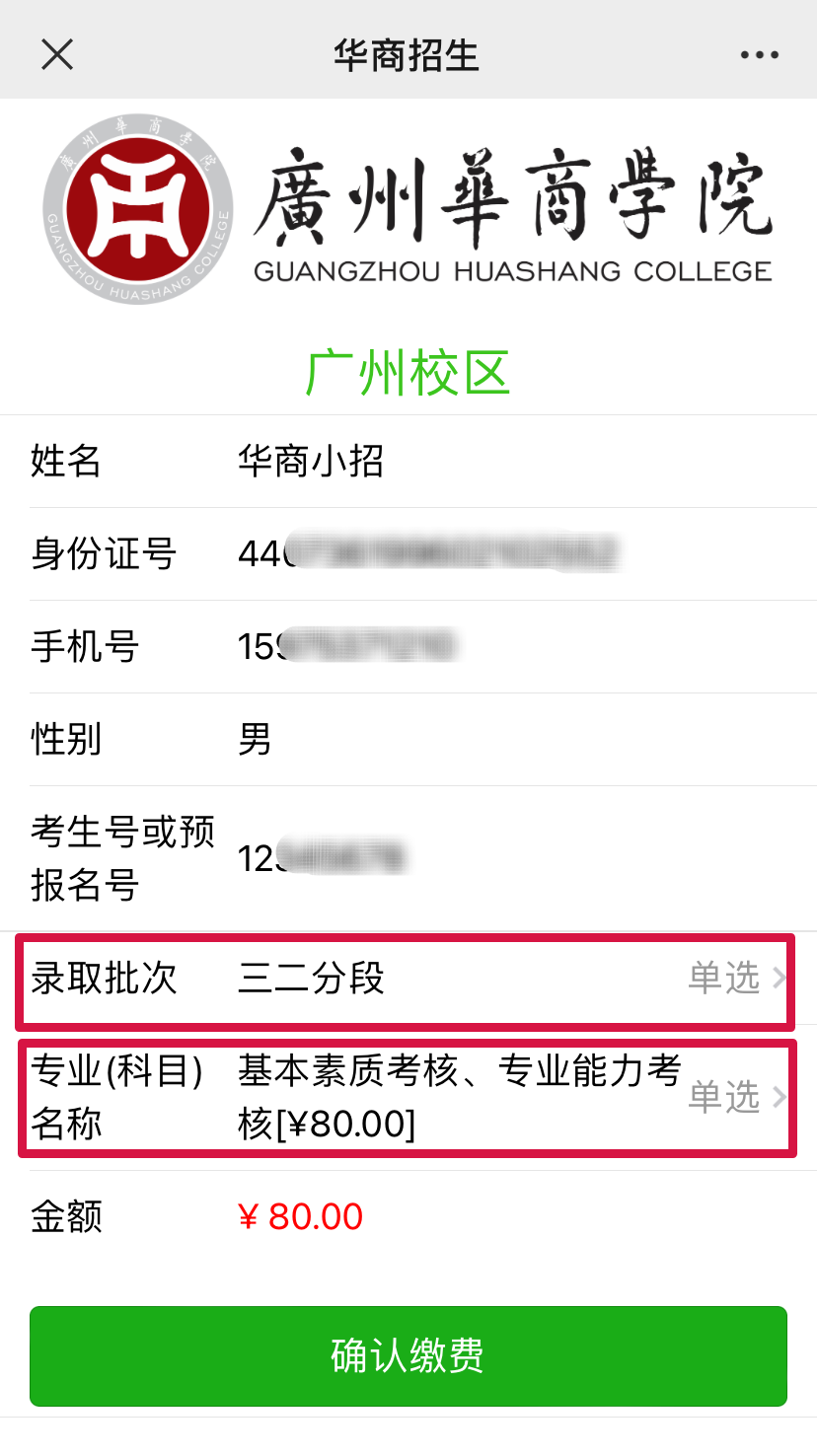 方式2.进入“威廉希尔中文网站招生办公众号”,选择菜单栏“招生资讯”—“报考费”;进入缴费页面;准确填写个人信息,点击“下一步”;选择三二分段批次及科目;核对相应金额,无误后点击“确认缴费”即可。