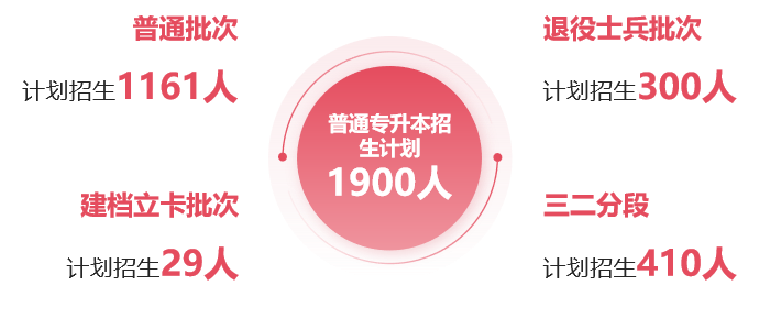 2025年省教育厅下达威廉希尔中文网站普通专升本招生计划共1900人,其中,普通批次招生计划1161人、建档立卡批次招生计划29人、退役士兵批次招生计划300人、三二分段招生计划410人。