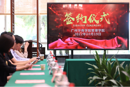 参加签约仪式的有:副校长张捷教授、管理学院院长李招忠教授、副院长秦陇一教授、院长助理袁仕海副教授、校产教融合办主任唐显锋主任、产教融合专员曾惠玲老师、创业创新秘书杨惠茜老师以及四家签约企业的代表。四家企业的代表分别是:用友•新道科技股份有限公司及总经理黄堪敬一行、广州猎腾人力资源服务有限公司刘艳总经理一行、深圳孵创兴华专利代理有限公司总经理林光明一行、广州星耀彼岸(昆仑控股)教育有限公司华南区总监肖训智一行。