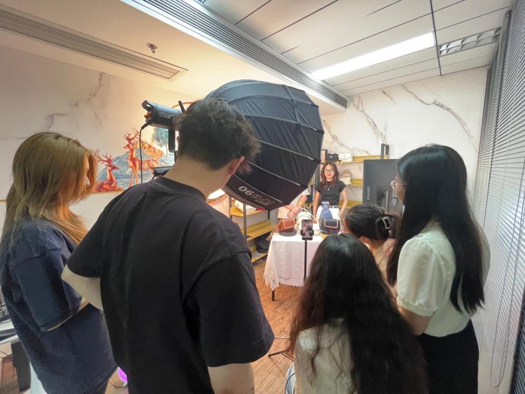 5月14日,在经济贸易学院跨境电子商务系张嘉欣老师和曹维老师的带领下,21级国际经济与贸易专升本一班学生徐诗晴、二班学生蔡李凯、袁金意,以及23级跨境电子商务1班学生官依琳走进了广州知鼎策划咨询有限公司,迎来了一次意义非凡的跨境电商直播实战机会,亲身体验了TikTok直播带货的魅力。这不仅是一次知识与实践的完美结合,更是对同学们未来职业生涯的提前预热。