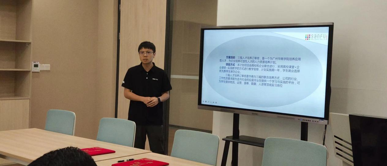 企业方代表蔡东辽经理围绕合作背景、三福人才订单班基本情况及实习就业安排对订单班的基本情况作了介绍。