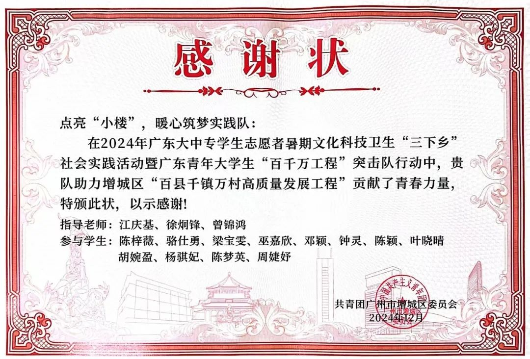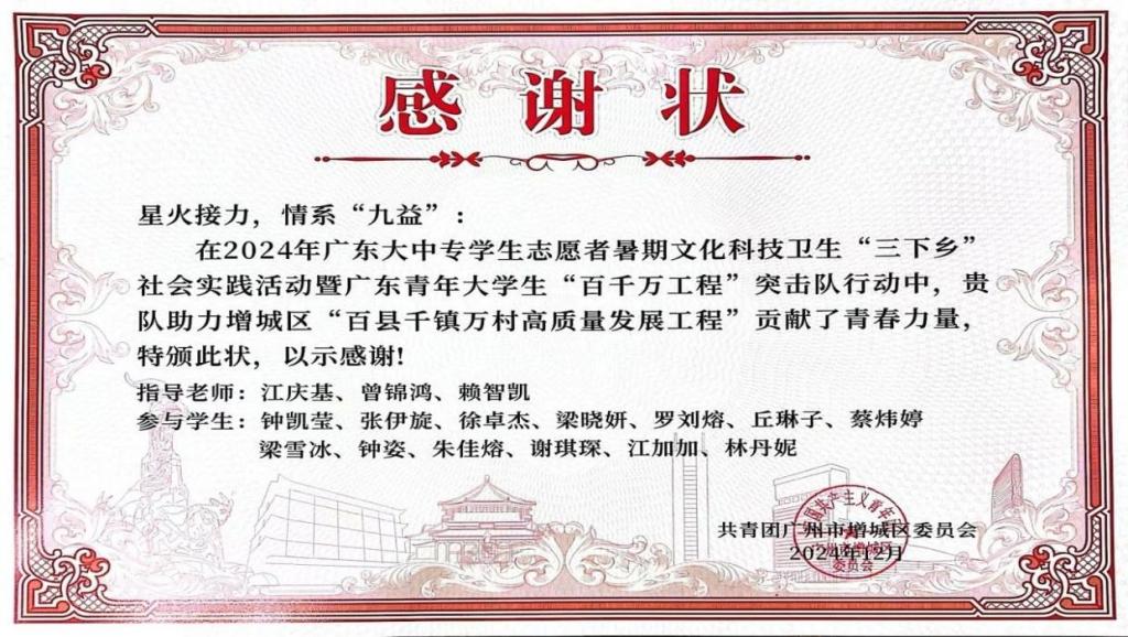 近日,威廉希尔中文网站教师教育学院组建的“星火接力,情系‘九益’”“点亮‘小楼’,暖心筑梦”“乐享夕阳,‘艺’缕阳光”三支社会实践队伍,因在增城区“百县千镇万村高质量发展工程”中表现突出,荣获共青团广州市增城区委员会颁发的感谢状。这是对教师教育学院学子践行社会责任、服务基层发展的充分肯定,彰显了华商学子在乡村振兴中的青春担当。