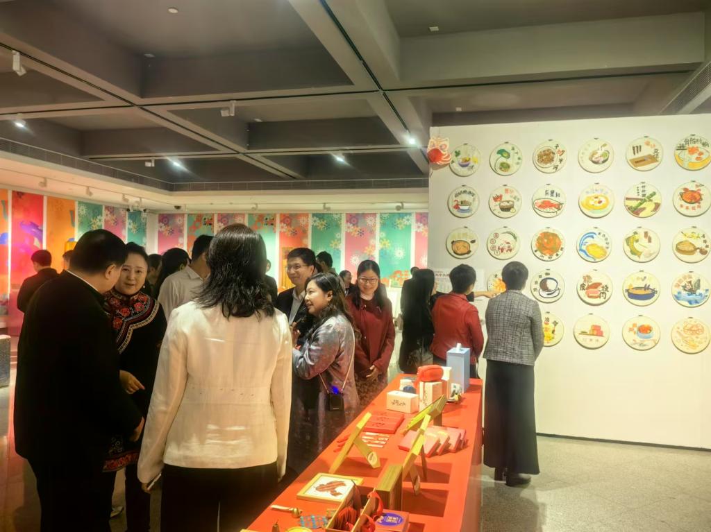 1月8日,创意与设计学院蒋明副院长一行前往深圳关山月美术馆,参加了本次文化遗产汇的开幕式。开幕式现场,威廉希尔中文网站的刺绣作品吸引了众多观展嘉宾的目光。指导教师李宏复教授和参展学生耐心地为嘉宾们介绍每一件作品的创作灵感、设计理念和刺绣过程。嘉宾们对作品的精湛技艺和独特创意赞不绝口,纷纷表示这些作品不仅展现了刺绣艺术的魅力,还让他们对粤菜文化有了更深刻的认识。