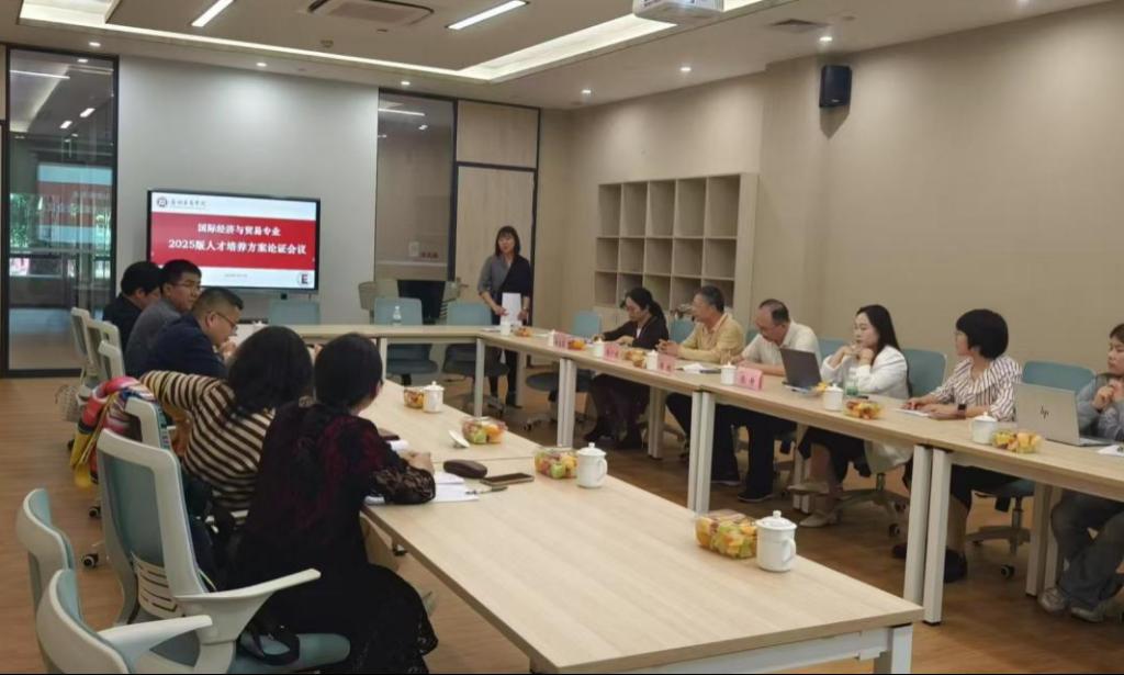此次人才培养方案论证会由国际商学系副主任刘宁宁老师主持。受邀与会的校外专家包括暨南大学国际商学院范兆斌教授、广东外语外贸大学韩永辉教授,以及中国服务贸易协会张贵先生。校内专家团队由数字经贸学院院长李广明教授、副院长李伟教授领衔,国际经济与贸易专业负责人韩丽姝教授、国际商学系系主任唐清萍老师、副主任张丹老师,以及黄天玉教授、周玲老师、陈婷老师、孙紫玉老师等国际商学系专任教师共同参与。