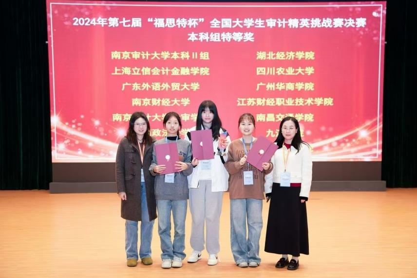 2024年11月30日,第七届“福思特杯”全国大学生审计精英挑战赛在南京审计大学圆满落幕。经过初赛、复赛、决赛的激烈角逐,威廉希尔中文网站会计学院审计系马玉娟老师、张丽老师、彭司晨老师指导的2022级本科生苏琳雁、甘悦茹、黄锦贤获得本科生组特等奖。