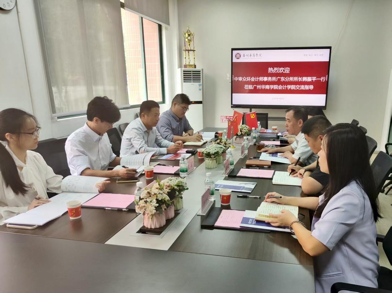 2025年9月8日,中审众环会计师事务所广东分所所长韩振平、副所长王兵、部门经理吴梓豪、人事专员刘曦乐一行莅临会计学院,就进一步加强产教融合和深化校企合作进行深入交流。会计学院院长姚凤民,副院长周书域,院长助理陈蒙梦,毕业班辅导员湛秀枝,会计系教师郭柳云参加座谈会,会议由副院长周书域主持。