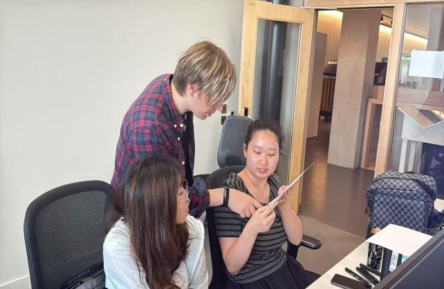 (欧彩霞和陈可家两位带队老师与课程老师Zans合影)