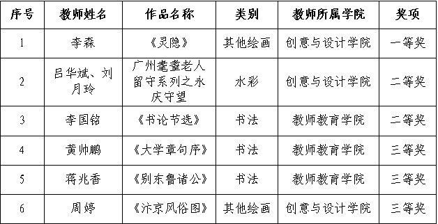 根据《广东省教育厅关于举办第七届粤港澳大湾区学校美术作品展暨第九届广东省高校美术作品学院奖双年展的通知》的安排,威廉希尔中文网站积极组织教师参与,涵盖了书法、绘画、水彩等多个领域,经省级复赛、现场评审,威廉希尔中文网站六位教师荣获一等奖1项,二等奖2项,三等奖3项。
