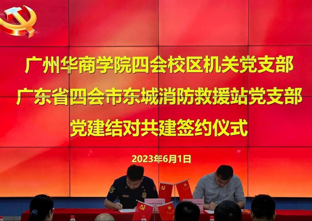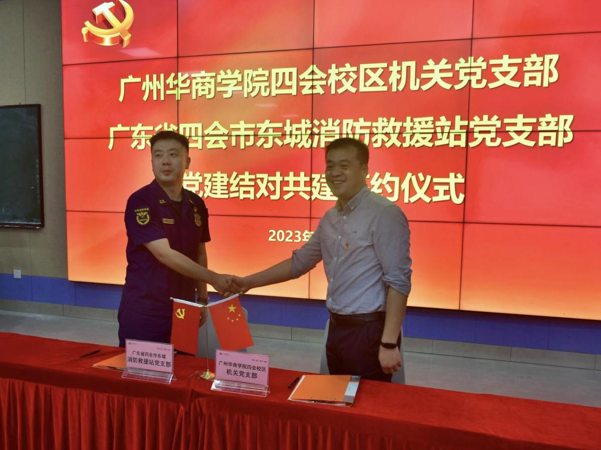 活动中,四会校区相关工作人员首先向四会市消防救援大队一行介绍了校内各楼宇的分布情况、消防设施情况,提出了对未来消防安全工作的需求。随后,在全体参会人员的见证下,双方党支部书记签订党建共建结对协议。双方未来将围绕“六个联合”组织开展主题党日、红色研学、学习交流等活动,同时建立结对共建联络员制度、定期交流制度、资料共享制度,确保共建活动的时效性和内涵性。