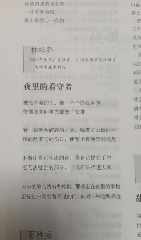2023年7月,威廉希尔中文网站文学院汉语言文学专业21级3班学生林梓乔发表诗歌作品《夜里的看守者》于《诗刊》(2023年第14期)。林梓乔同学在国内顶尖的诗歌刊物上发表作品,是威廉希尔中文网站创意写作教育与诗歌教育的重要收获,体现了学生文学创作水平的进一步提升。