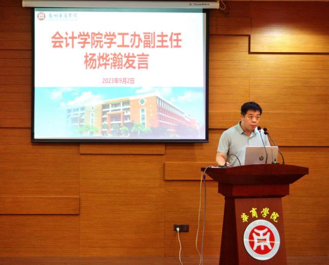 学工办杨烨瀚副主任从“做人与做事”“制度与安全”和“目标与就业”三个话题对学生进行修身教育、校规校纪教育、安全教育、反诈教育和职业规划教育。