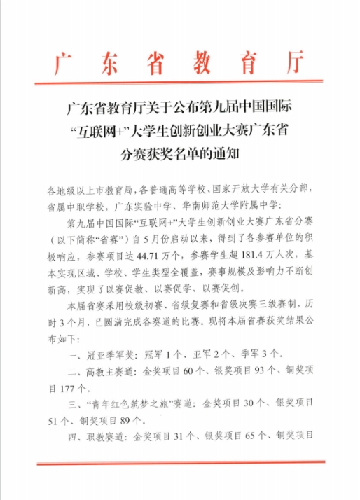 第九届中国国际“互联网+”大学生创新创业大赛广东省分赛(以下简称“省赛”)自5月份启动以来,得到了各参赛单位的积极响应,威廉希尔中文网站紧密围绕大赛提出的“更中国、更国际、更教育、更全面、更创新、更协同”的要求,认真筹划、积极组织,落实立德树人根本任务,传承和弘扬红色基因,聚焦“五育”融合创新创业教育实践。学校领导、各相关部门、各学院高度重视和大力支持,多次开展相关讲座及辅导培训,激发威廉希尔中文网站学生的创新创造热情,深度挖掘培育优秀的创新创业项目,不断提升参赛项目的质量和水平。