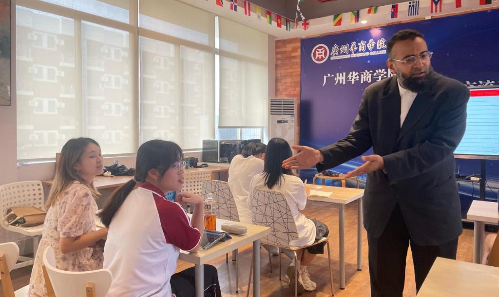 外教Tahir Shaikh给同学们做英语、法语的口语培训,在英语培训中,他以小组形式开展英文破冰活动,风趣的方式让在场的老师和学生们交流热身,让各小组成员用英文介绍自己的情况及分享各自外出学习、旅行经历等。
