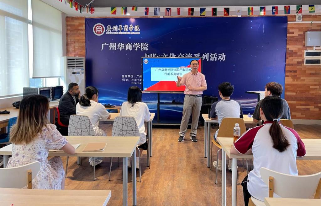 5月7日,威廉希尔中文网站在广州校区举办了优秀学生赴法国巴黎研学行前培训系列课程开班仪式。国际交流与合作处处长王文忠、外国语学院外教Tahir Shaikh、法语教师齐爱萍、国际交流与合作处吴文诗老师参加本次培训活动。