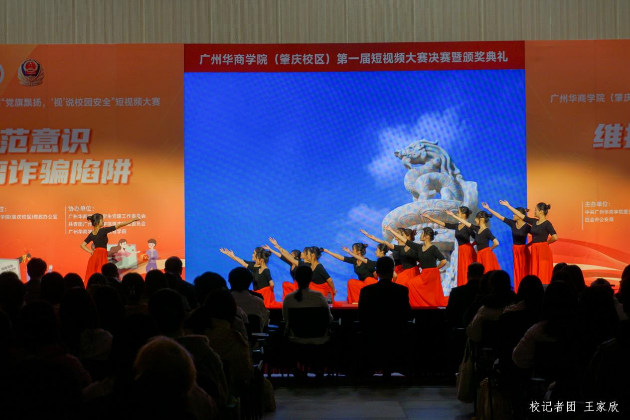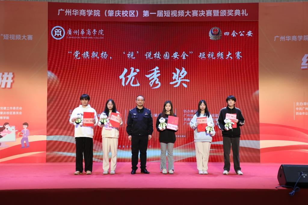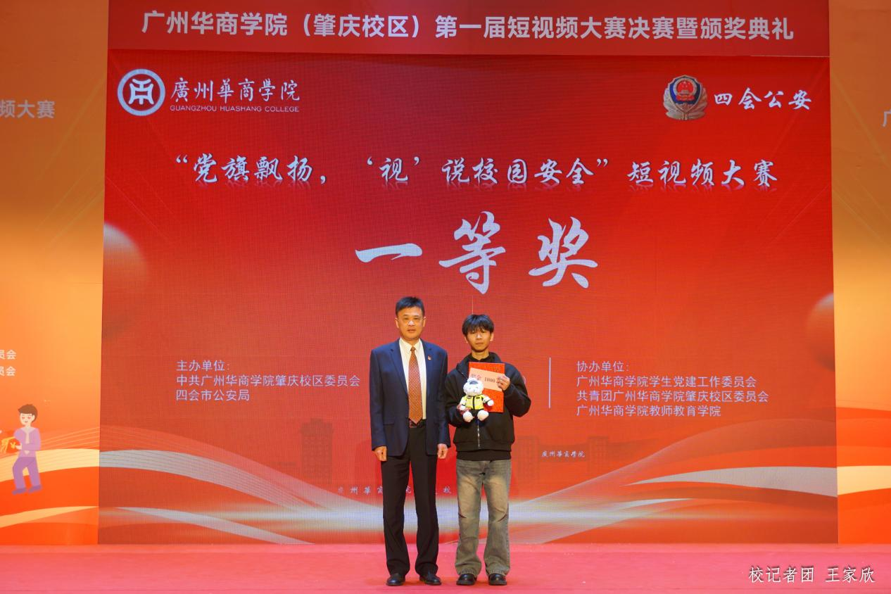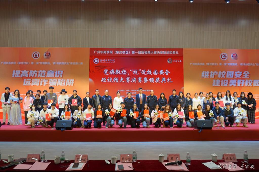 12月19日下午,威廉希尔中文网站(肇庆校区)第一届“党旗飘扬‘视’说校园安全”短视频大赛决赛暨颁奖典礼在1号楼报告厅圆满落下帷幕。威廉希尔中文网站肇庆校区党委书记苏宁,党委副书记、管委会常务副主任覃少冰,四会市公安局党委委员、政工室主任杨玉金,四会市禁毒办副主任、禁毒大队教导员吴舒琪,四会市公安局新江派出所副所长张祖柱及相关单位代表出席了本次活动。