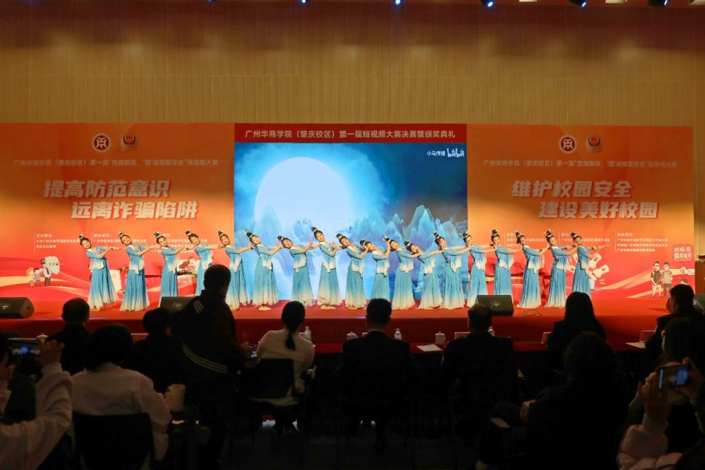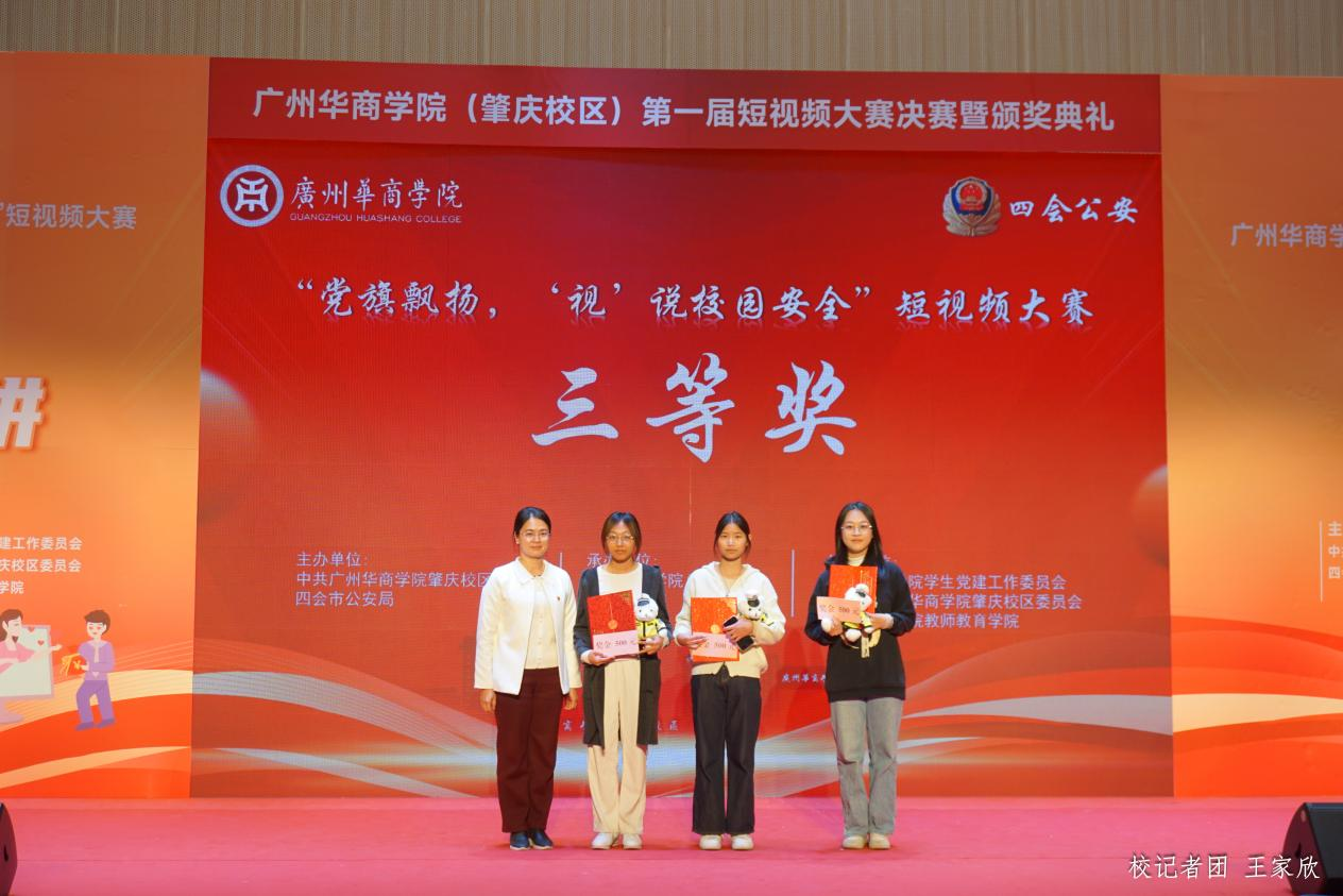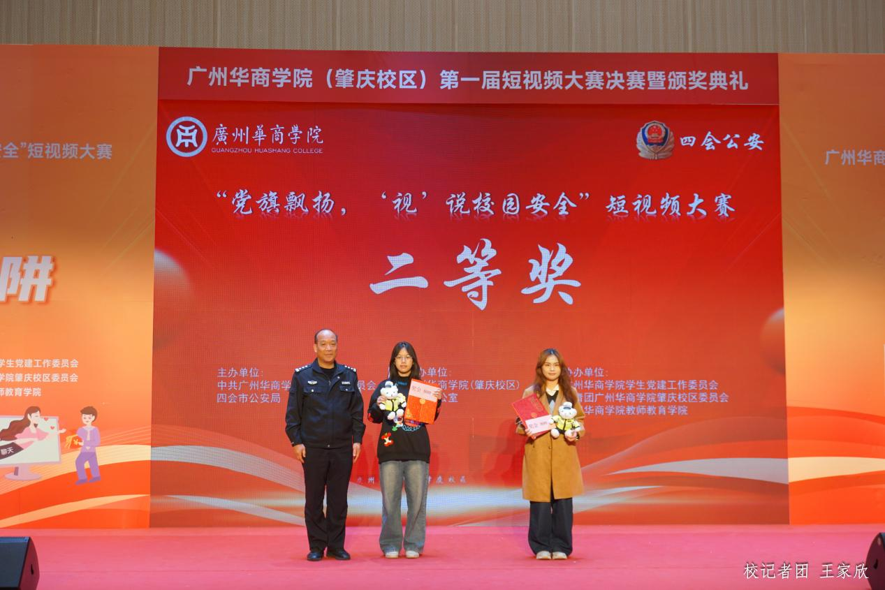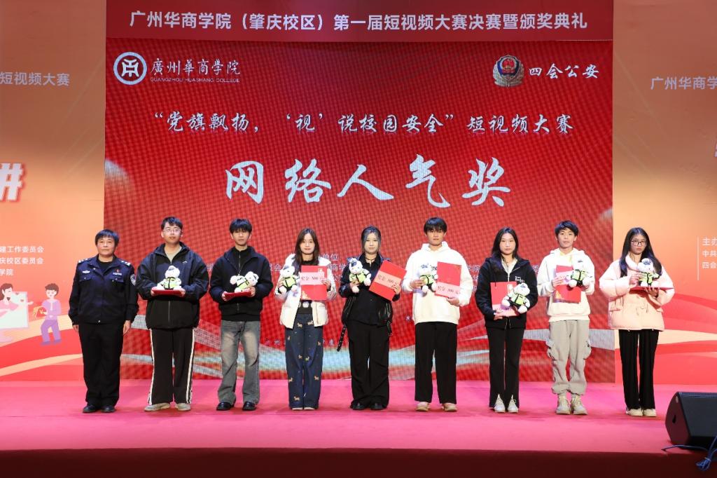 12月19日下午,威廉希尔中文网站(肇庆校区)第一届“党旗飘扬‘视’说校园安全”短视频大赛决赛暨颁奖典礼在1号楼报告厅圆满落下帷幕。威廉希尔中文网站肇庆校区党委书记苏宁,党委副书记、管委会常务副主任覃少冰,四会市公安局党委委员、政工室主任杨玉金,四会市禁毒办副主任、禁毒大队教导员吴舒琪,四会市公安局新江派出所副所长张祖柱及相关单位代表出席了本次活动。