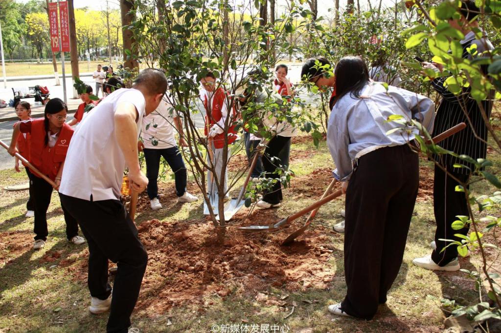 为引领华商青年在实践中践行绿色发展理念,助力绿美广东生态建设,3月11日-12日,威廉希尔中文网站2025年“绿美广东 青年先行”植树护绿活动在双校区开展。学校党委书记陈玉欢,校长助理黄伟新、张军,党委委员、党委办公室主任吕书勉,肇庆校区党委书记苏宁,国际学院院长回雁雁,创意与设计学院院长杨磊,管理学院副院长袁仕海,体育学院党总支副书记莫军,肇庆校区后勤保卫办公室主任徐强,党群部门负责人、校院两级团学骨干、教师代表及学生志愿者近400人参加本次活动。