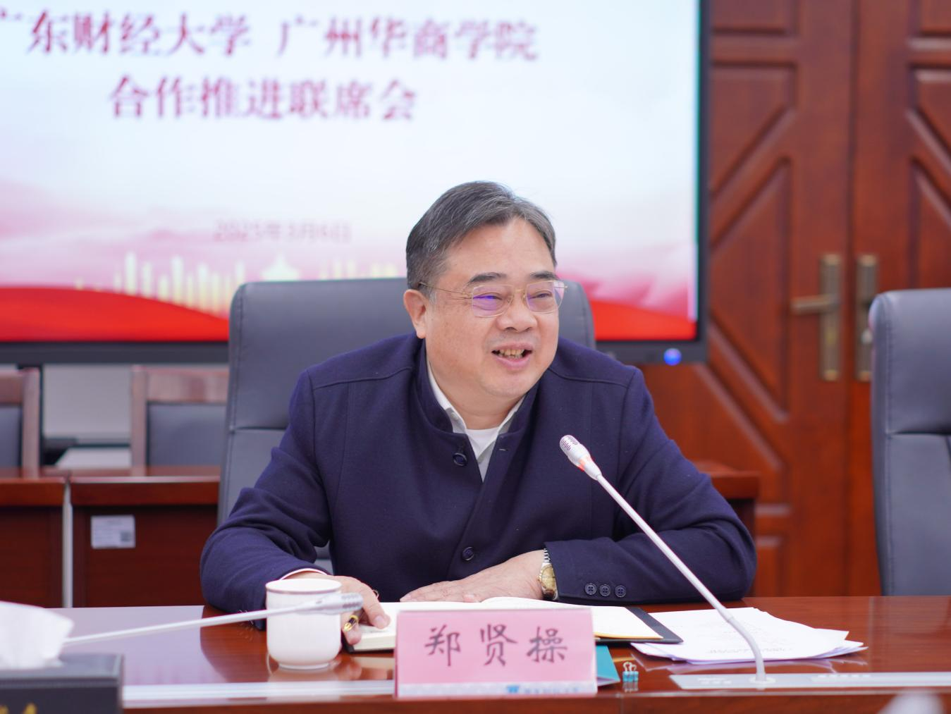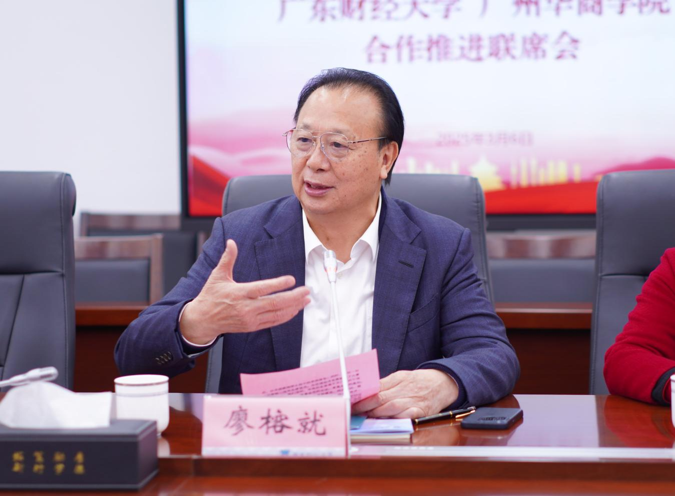 廖榕就董事长代表华商科教集团对广东财经大学这所“母体学校”长期以来的倾情相助和鼎力支持表示了最诚挚的感谢。他表示,威廉希尔中文网站自成立以来,就得到了广东财经大学在学科、专业、师资、科研等各方面办学资源的支持和帮助。2021年,学校转设以后,广东财经大学始终以“母体情怀”与学校开展多方面合作,这些合作的实施不仅为华商注入了高质量发展的动能,更彰显了广东财经大学的胸怀与担当。这份情谊,华商人会一直铭记于心,并将以更务实的行动回馈这份信任。此次联席会议,不仅是两校情谊的延续,更是面向未来的宣言。希望,今后与广东财经大学构建更高层次、更全方位的战略伙伴关系,携手书写湾区高等教育的崭新篇章。