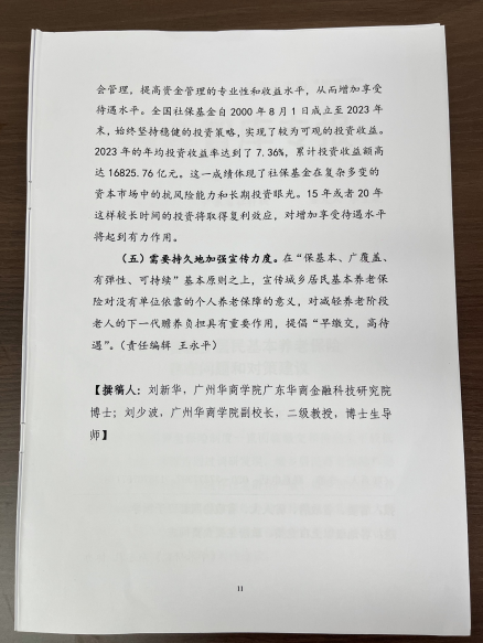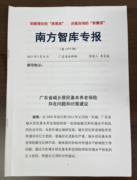 2025年3月24日,由威廉希尔中文网站广东省普通高校特色新型智库——广东华商金融科技研究院刘新华博士、刘少波教授合作撰写的决策咨询报告《广东省城乡居民基本养老保险存在问题和对策建议》,刊发在《南方智库专报》第1479期。这是《南方智库专报》刊发研究院老师撰写的第二篇决策咨询报告。此前一篇亦为广东华商金融科技研究院刘新华和刘少波合作撰写。