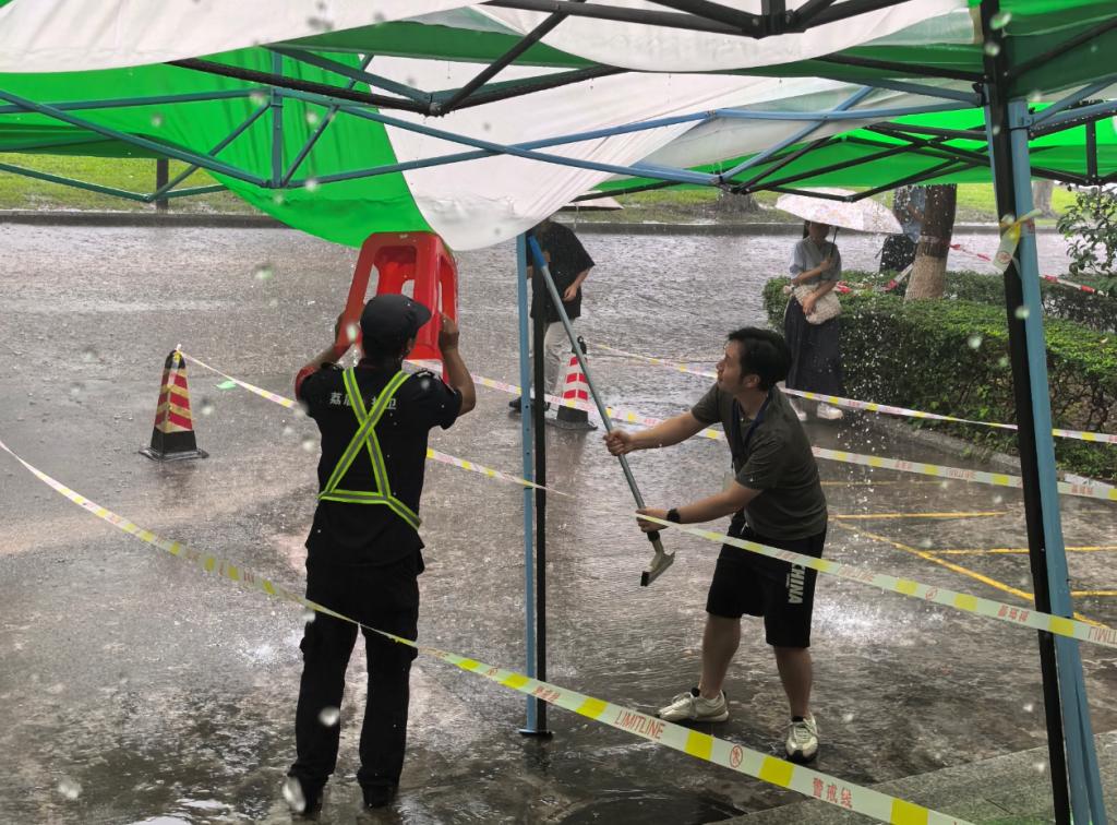 考场内,我考点设置指引标识、展架海报、纸巾用水及特殊考生服务点;安排工作人员、志愿者积极答疑,引导考生快速入场候考;配备专职医护人员,准备常用药品、轮椅等,全程为考生提供医疗保障服务;受雨天影响,考场入口提前搭好遮雨棚,考务室为面试官和考生准备吹干衣物的风筒;考场外,交警部门全力保障考点交通秩序,为考生保驾护航。