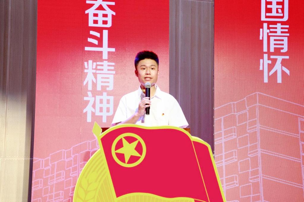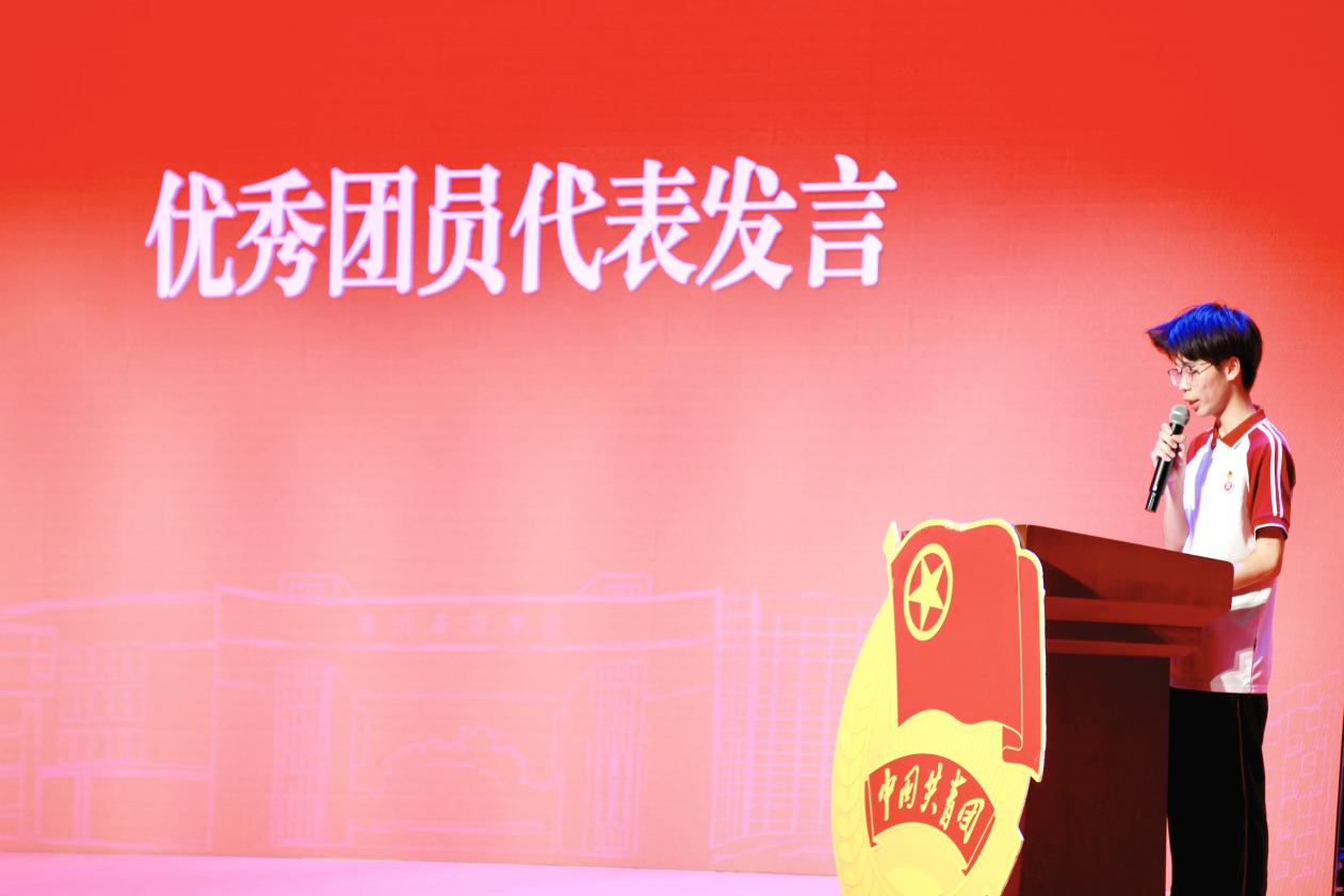 优秀团员代表教师教育学院23级小学教育11班黄海楷同学发言。他结合自身经历,从以下三点与同学们共勉:一、团徽见初心,携手共成长。团徽是大家从懵懂到坚定的见证者,号召各位团员积极投身时代;二、行动见誓言,实践共蜕变。团员应积极参加团员班会,努力让思想引领,入脑入心;三、笃行建未来,争做新时代青年先锋。坚定的信念要在心中扎根,坚持为之奋斗。