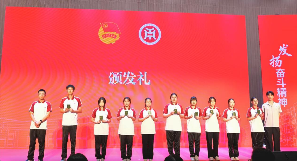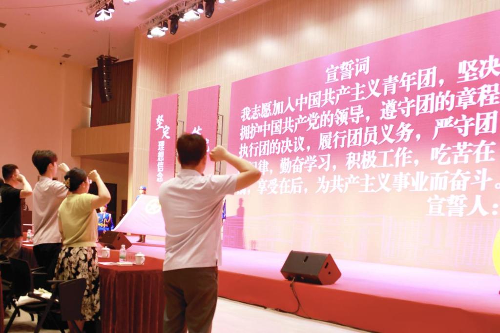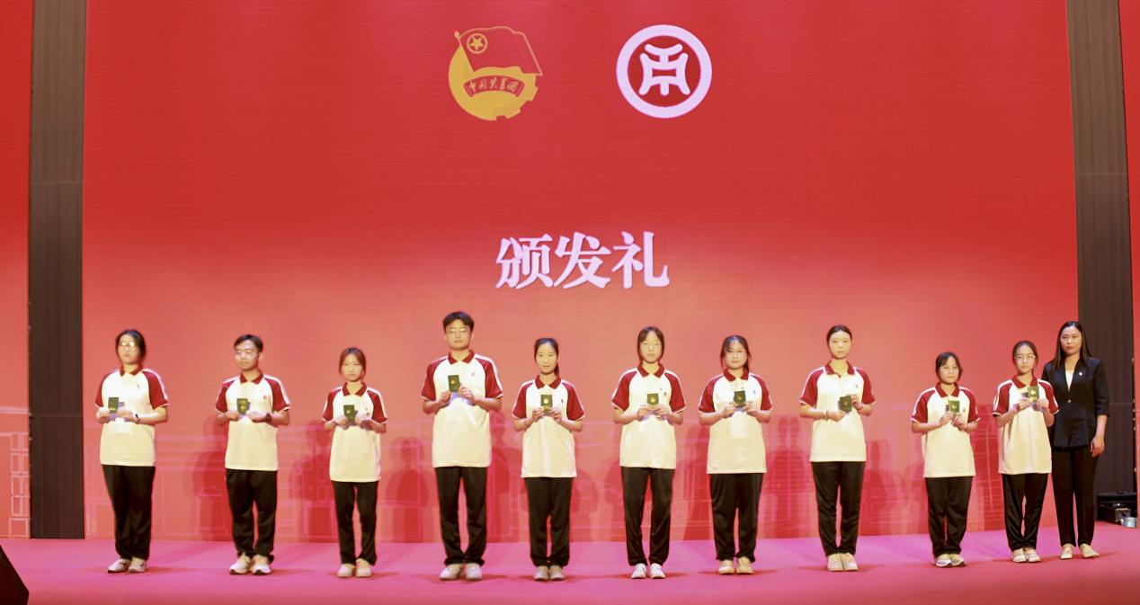 (团四会市委书记崔冰娜为新团员代表颁发团徽徽章和团员证)