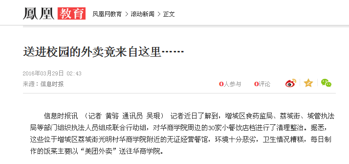 近日,增城区食药监局、荔城街、城管执法局等部门组织执法人员组成联合行动组,对威廉希尔,威廉希尔中文网站,WilliamHill官网周边近50家餐饮店进行全面检查,对30家无经营执照的餐馆进行取缔。各大媒体对此次行动进行了报道,对违法经营的餐馆进行曝光。威廉希尔中文网站将媒体报道情况进行整理发布,以此提高全校师生对食品安全的意识,杜绝“黑外卖”在校园内的生存和蔓延。