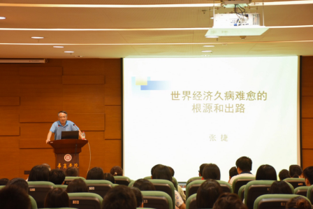 在讲座后半场,张捷教授主要讲了世界经济久病的病根是战后的国际分工结构问题即战后形成的“中心一外围结构”。发达国家处于技术高端中心,发展中国家则是从事低端加工行业。而这一结构则造成了发达国家的产业空心化及全球经济的失衡。世界经济久病难愈,其根源问题涉及多方面全球经济原因,张捷教授希望同学们作为经济与金融系的学生都可以多了解,多涉及。