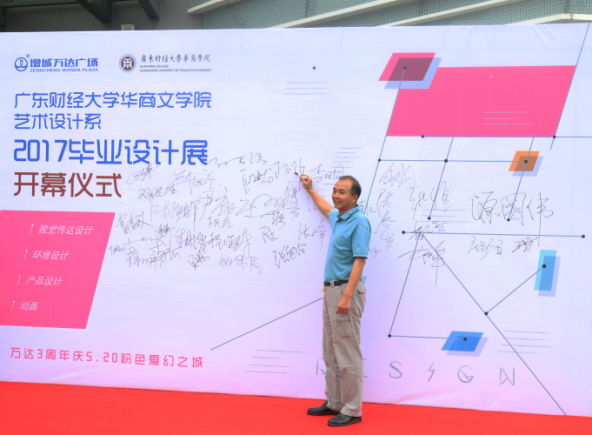 开幕仪式前,领导嘉宾纷纷在设计展海报上签名,表达对此次毕业展的期待。开幕式上,领导嘉宾为首届校园纪念品设计大赛的获奖同学颁发了优胜奖项。随后,学院王列耀副院长上台为本次活动致辞。王院长对艺术设计学系的老师和同学们多年来不懈的努力给予了充分的肯定,并且寄予了对艺术设计学系继续奋发向上的期望。谈到毕业设计展时,王院长说:“本次设计作品展是华商人的智慧结晶,代表了华商的精神文化,同时也期盼同学们在未来能昂首挺胸,勇敢地走出华商,走向社会,走出国门,走向世界,继续传承发扬中华文化,用智慧为民族文化做出自己的贡献”。