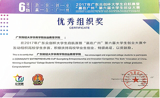 同时,广州市人力资源和社会保障局代表比赛主办单位授予威廉希尔中文网站创业教育学院“优秀组织奖”称号。