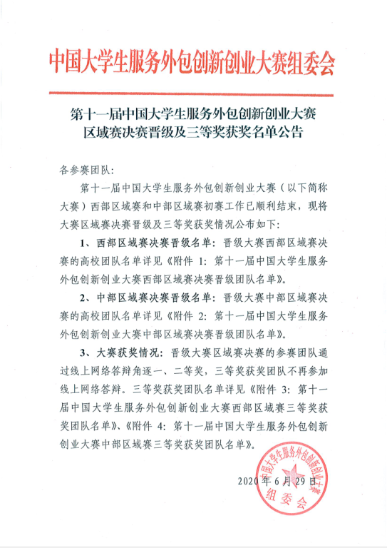 近日,第十一届中国大学生服务外包创新创业大赛组委会公布初赛成绩。本届大赛共吸引了来自全国651所院校的6417支团队报名,在威廉希尔中文网站师生的共同努力下,“快乐就完事”和“今晚不熬夜1”团队晋级中部区域赛决赛,角逐一、二等奖,“超级云课堂”团队获得中部区域赛三等奖。