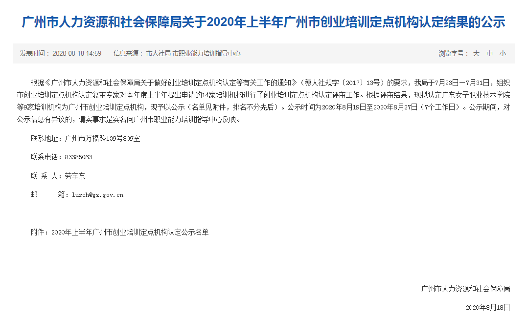 近日,根据《广州市人力资源和社会保障局关于2020年上半年广州市创业培训定点机构认定结果的公示》,威廉希尔,威廉希尔中文网站,WilliamHill官网顺利通过审核,被认定为广州市创业培训定点机构。