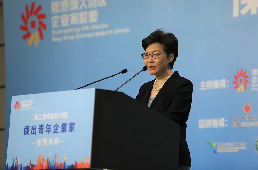 9月15日下午,第二届粤港澳大湾区杰出青年企业家颁奖典礼于香港、深圳、澳门三地同步举行。香港特首林郑月娥,中联办副主任谭铁牛,全国政协常委、粤港澳大湾区企业家联盟主席蔡冠深等担任主礼嘉宾;广东省副省长张新,澳门经济财政司司长李伟农,深圳市委常委、副市长艾学锋,华商教育集团董事长廖榕就等出席此次盛会。