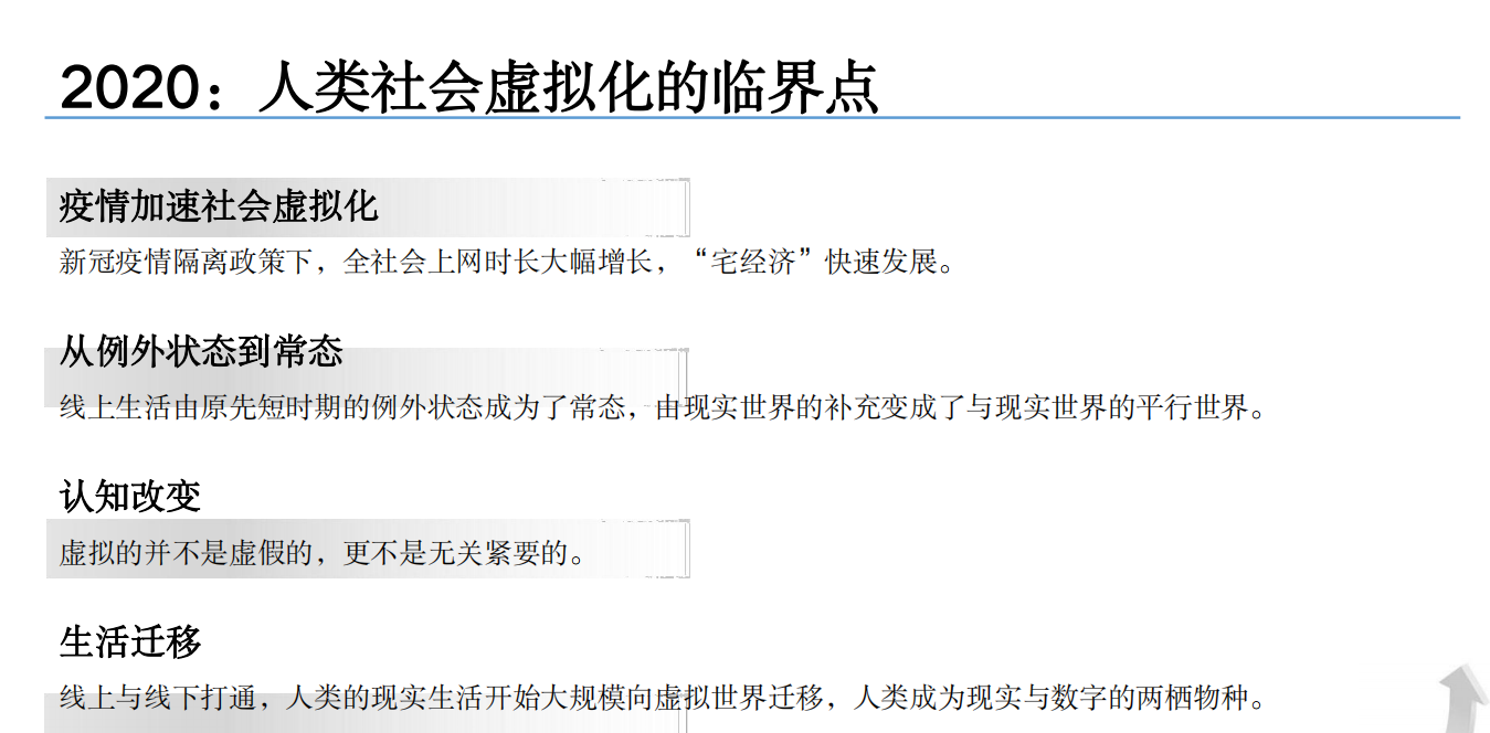 2020年,新冠疫情的爆发改变了人们的生活方式,人类社会进入虚拟世界与现实世界的“临界点”。
