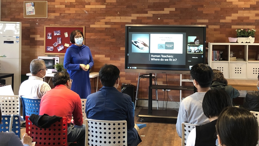为让老师们更好的理解“第二语言的教学前沿理念”,祁静博士以人工智能—AI教育为例,分别介绍了人工智能在教师教学、学校管理中发挥的作用。她表示人工智能在第二语言学习和教学中有广泛的技术和方法,不论是机器学习、自适应学习、自然语言处理、数据挖掘还是算法等,在当今的教育行业都已被大范围使用。祁静博士解释说明了自适应教育和智适应教育两个不同的理念,并从水平分级、产品形态等方面详细地说明了两种教育模式的发展。祁静博士用通俗易懂的图文生动有趣地解释了看似深奥难懂的人工智能,讲座内容丰富,得到了老师们的肯定。